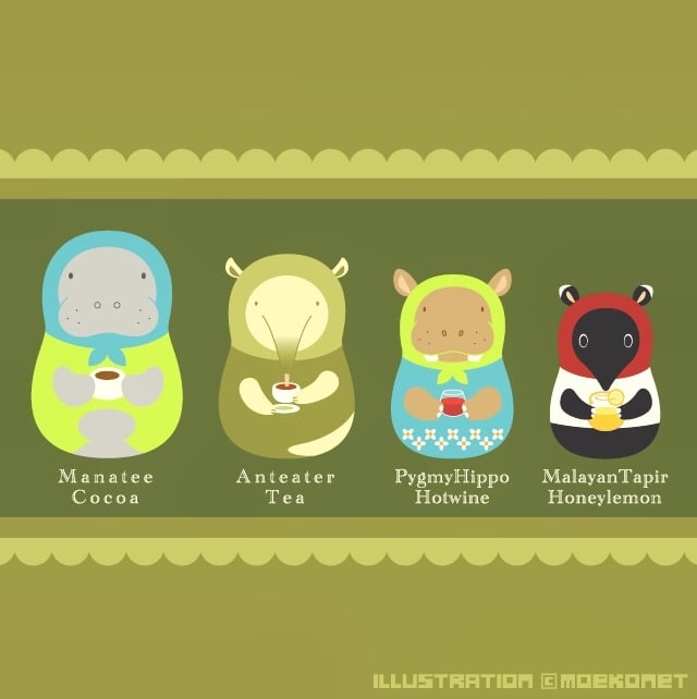 動物イラストNo.233「動物マトリョーシカとホットドリンク。」 動物イラスト2017.09.17 個人的に好きなマイナー動物たちをマトリョーシカに。 最近夜は寒いから、温かい飲み物付き。 マナティ(ココア)・アリクイ(紅茶)・コビトカバ(ホットワイン)・マレーバク(はちみつレモン) 1匹だけアルコール…?